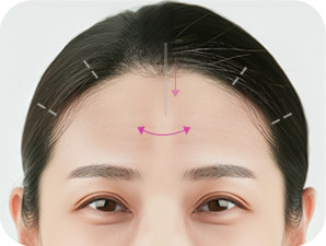 眉毛を引き下げる支持靭帯や眉毛下制筋を切開すると、眉毛挙上筋の生理的作用によって 額や眉毛が引き上がり、額の筋肉が伸びることで自然なボリューム感が生まれます。