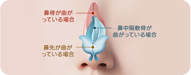 曲がった鼻とは、鼻筋から鼻先まで続くラインがC字型やS字型に 曲がって見える鼻のことです。