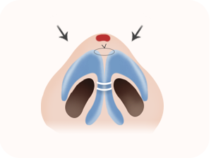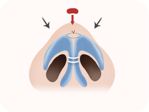 左右の鼻骨が対称になるように鼻骨を骨切りし、鼻先軟骨の微細な組織によって対称になるように仕上げます。