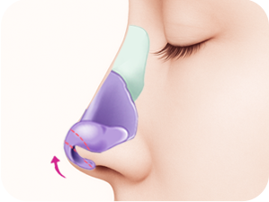 鼻先の軟骨を切除し、鼻中隔延長術を用いて鼻軟骨を移動させた後、固定して垂れた鼻先を持ち上げます。