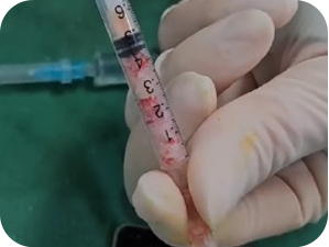 自家軟骨のみを注入せず、自家血液から分離した繊維素凝縮液を一緒に注入 しますが、繊維素凝縮液は自家軟骨の破片が散らばらないように粘度を高め、 軟骨の生存に必要な成長因子などを含んでおり、自家軟骨の生存率を高める 働きをします。