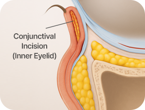 Incision is made along the outer corner of the eye, inside the conjunctiva.