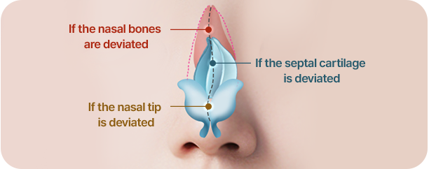 Depending on the degree of deviation, the asymmetry of the nose bridge is corrected, and cartilage grafting is performed to improve both functional and aesthetic aspects.