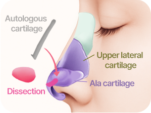 If the nasal tip cartilage is too large, it may be trimmed slightly or sutured to shape it. To achieve a more defined tip, autologous cartilage is grafted to create a sharper contour.
